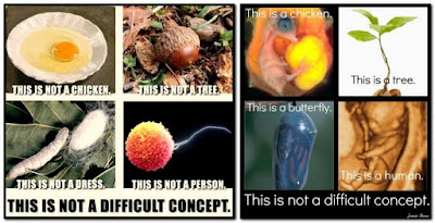 Abortion is totally NOT my issue, and I'd be the first to say that WHERE to draw the line is a difficult thing. But a newly fertilized egg is NOT a person. Not yet. Argue about WHEN that happens all you like (the Bible, interestingly, implies that BREATH is life), but don't tell me that last picture is a person. And don't pretend you don't "get" what this analogy is about.
