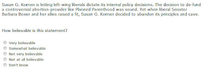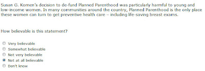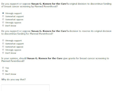 Susan G. Komen for the Cure recently emailed me a link to a survey, which reveals some interesting clues to Komen’s thought process. The survey is only available to those who received an email, but I took plenty of screenshots. The questions indicate that, while Planned Parenthood rejoices that they’ve won the battle, Susan G. Komen is still weighing its options.