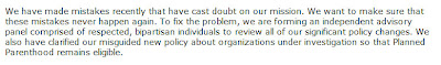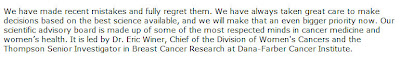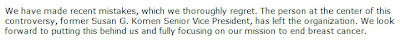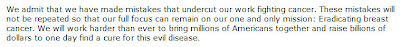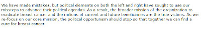 I'd like to say that — but how are they supposed to reassure people that they aren't going to vacillate any more? Betrayal is hard to forget. I believed Nancy Brinker when she said they'd never cave to political pressure. If I can't rely on that level of sincerity and passion in words, they really need to double up on the actions.