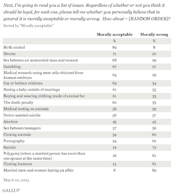 Those results got a lot of attention, and deservedly so. But Gallup didn’t just poll on abortion; they conducted a broader survey on a range of moral issues. Examining abortion in the context of this broader polling yields some even weirder discrepancies. Click to enlarge: