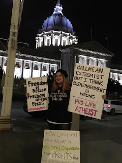 The majority of the crowd was millennial women, and some men. There were some of the older generations there as well, far less then I’d expected. Most of them would walk by the protesters and quietly read the signs as they entered the building. Members of PLFSF handed out the pink contracts saying “Would you like some information on Planned Parenthood”? Many of them took the pink paper without a second thought. Some refused it. One girl took one and then kindly came back outside and said “I’m sorry I don’t want your propaganda”. There were also two counter protesters. The two women simply stood on the other side of the entry way holding their signs too. The lack of hostility from everyone was almost alarming. Most were totally polite. There weren’t any weird tense moments. Just real conversations, and quiet stares.
