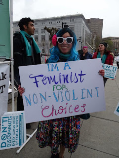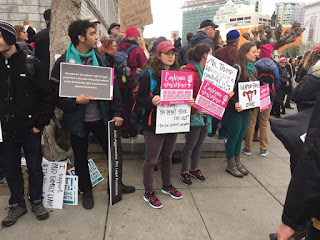 The West Coast Walk for Life drew 50,000 attendees to Civic Center and down Market Street for the annual event. As the crowd moved from the plaza to Market Street, attendees of the Women’s March began to fill the plaza. I was joined by pro-life friend and ally Aimee Murphy of Life Matters Journal as well as about 10-15 (give or take depending on the time) members of our respective groups. I held signs that said “Atheist, Feminist, and Pro-Life – Human Rights for All Humans” and “Mr. Trump, xenophobia is not pro-life.” Several of us wore shirts that read “This is what a pro-life feminist looks like.”