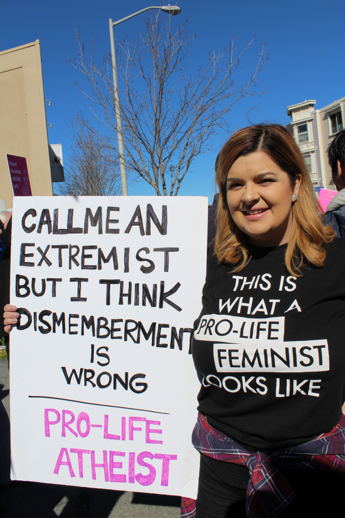 When I first arrived on the scene it was about 45 minutes before the event was scheduled to start. Only one of my fellow pro-life organizers was present at the time and there were about 50 counter protesters present. The group saw me immediately as I turned the corner to proceed down the street to the protest site. I was wearing a shirt that said “This is what a pro-life feminist looks like” and carrying a large sign with the SPL slogan “Call me an extremist, but I think dismemberment is wrong” along with “pro-life atheist”. It easily attracted shouts from the other side. One guy screamed “There’s no such thing as a pro-life feminist”, to which I replied “We exist”! Both sides were fenced off and separated by a couple of yards. There a woman that wanted to talk to me immediately, but the police asked us to stay on separate sides or go beyond the zoned area. We walked over to the side and had a conversation mostly about all of our common ground (while Planned Parenthood supporters circled us in an attempt to conceal my messaging). She was surprised to learn that surgical abortions took place in that facility, but was generally concerned about ensuring women had access to health care. Another woman wanted to have a more public conversation from our respective sides of the barrier. We established a great deal of common ground, but again differed on how to achieve equality.