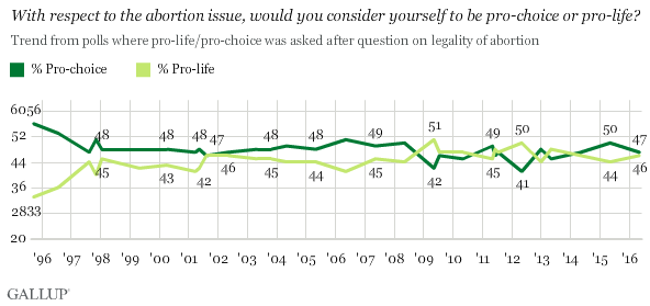 Though there is a unified Republican and therefore “pro-life” government and an increasingly pro-life American youth, we are very far from reaching a pro-life stronghold in this country, as shown above in a Gallup tracking poll. And with increasingly polarized politics, the term “pro-life” is read by some outside the movement as an attempt to force values down others’ throats. Given the gravity of abortion and how important it is to sway public opinion on this, pro-lifers everywhere need to be committed to swiftly changing tactics and appeal to people that don’t fit the traditional pro-life mold.