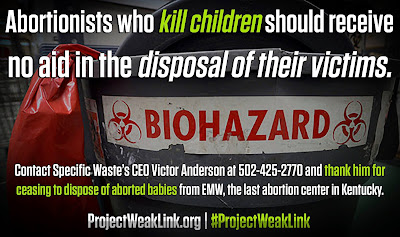 Yesterday, Project Weak Link organizers shared a statement from Specific Waste Industries indicating that it had terminated its contracts with abortion facilities, including the notorious EMW Women’s Surgical Center in Kentucky. Project Weak Link says that it will “trust but verify” the statement, and encourages pro-life advocates to email the CEO of Specific Waste Industries with a message of thanks for doing the right thing.