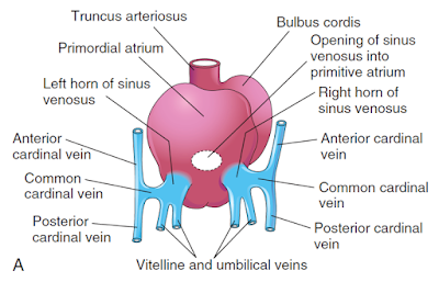 Additionally, by 4 weeks the embryo has three paired veins draining into the heart: vitelline veins return poorly oxygenated blood from the umbilical vessel, umbilical veins carry well-oxygenated blood from the chorionic sac, and cardinal veins return poorly oxygenated blood from the embryo’s body to the heart. Here is an illustration from figure 13-5 of Moore of the heart at 24 days postfertilization: