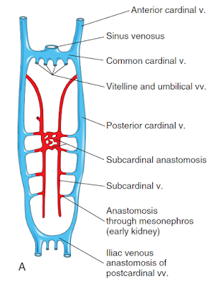 This image is from Figure 13-4, the caption for which states, “Initially, three systems of veins are present: the umbilical veins from the chorion, vitelline veins from the umbilical vesicle, and cardinal veins from the body of the embryos.”