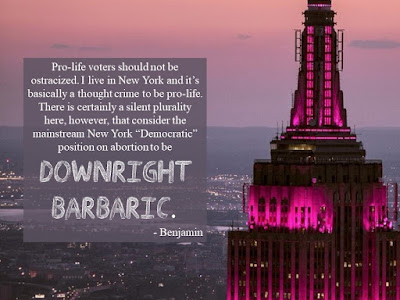 Benjamin: I would say that pro-life voters should not be ostracized. I live in New York and it’s basically a thought crime to be pro-life. There is certainly a silent plurality here, however, that consider the mainstream New York “Democratic” position on abortion to be downright barbaric. Recall Gov. Cuomo’s “celebration” of the recent New York abortion law by mandating that the Freedom Tower be lit in pink (the law itself is truly remarkable in what it allows).