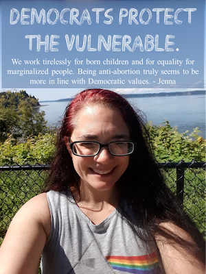 Jenna: Democrats protect the vulnerable in society. We work tirelessly for born children, and for equality for marginalized people. Being anti-abortion truly seems to be more in line with Democratic values than with the values of a party that does so little to help people thrive.