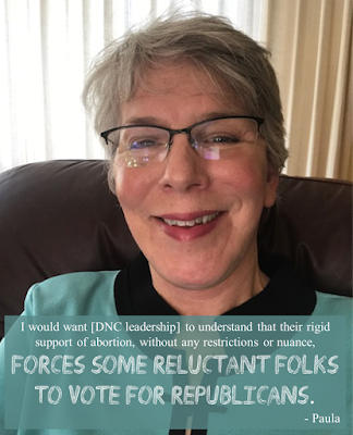 Paula: I support the Hyde Amendment. I was so disappointed in Joe Biden for caving into pressure regarding his support of the Hyde Amendment. I don’t want my tax dollars to be spent on abortion (or war or the death penalty or ICE). The Hyde Amendment seems like a good compromise on an issue that is so divisive. I am also very disappointed that abortion has become a litmus test for Democrats, and I don’t feel welcome in the party. I have FB friends who have blocked me over abortion. It saddens me that we can’t find some areas of agreement or compromise.