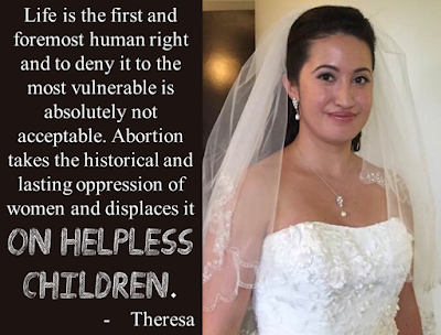 Theresa: Human rights begin the moment there is new human DNA. Life is the first and foremost human right and to deny it to the most vulnerable is absolutely not acceptable. Abortion takes the historical and lasting oppression of women and displaces it on helpless children. And a person isn’t valuable because he or she is wanted, but because he or she is human.