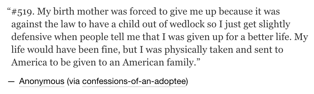In those hard cases, it is not right to claim that birth parents are selfish for wanting to keep their children. They are not irresponsible or cruel to want to be in their children’s lives as their primary caregivers. To go against these natural, biological yearnings and coerce people into placing their children for adoption is reminiscent of the days of decades ago, during the “baby scoop” era. The prevailing practice was “You’re an unfit parent? Then we’ll literally rip the baby from your arms and you’ll never see them again. Yay adoption!” We still see this attitude. In fact, some people see it as such a problem that they form organizations to fight against it.