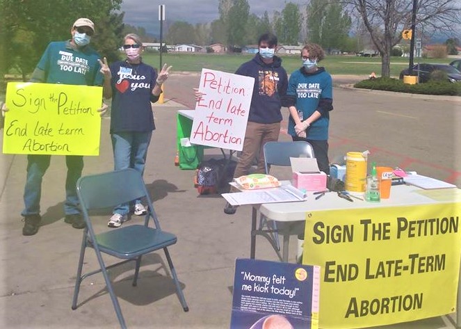 | Image Description: Signature collection volunteers wearing face masks hold signs in support of the petition to end late-term abortion in Colorado. Photo credit: Due Date Too Late on Facebook |