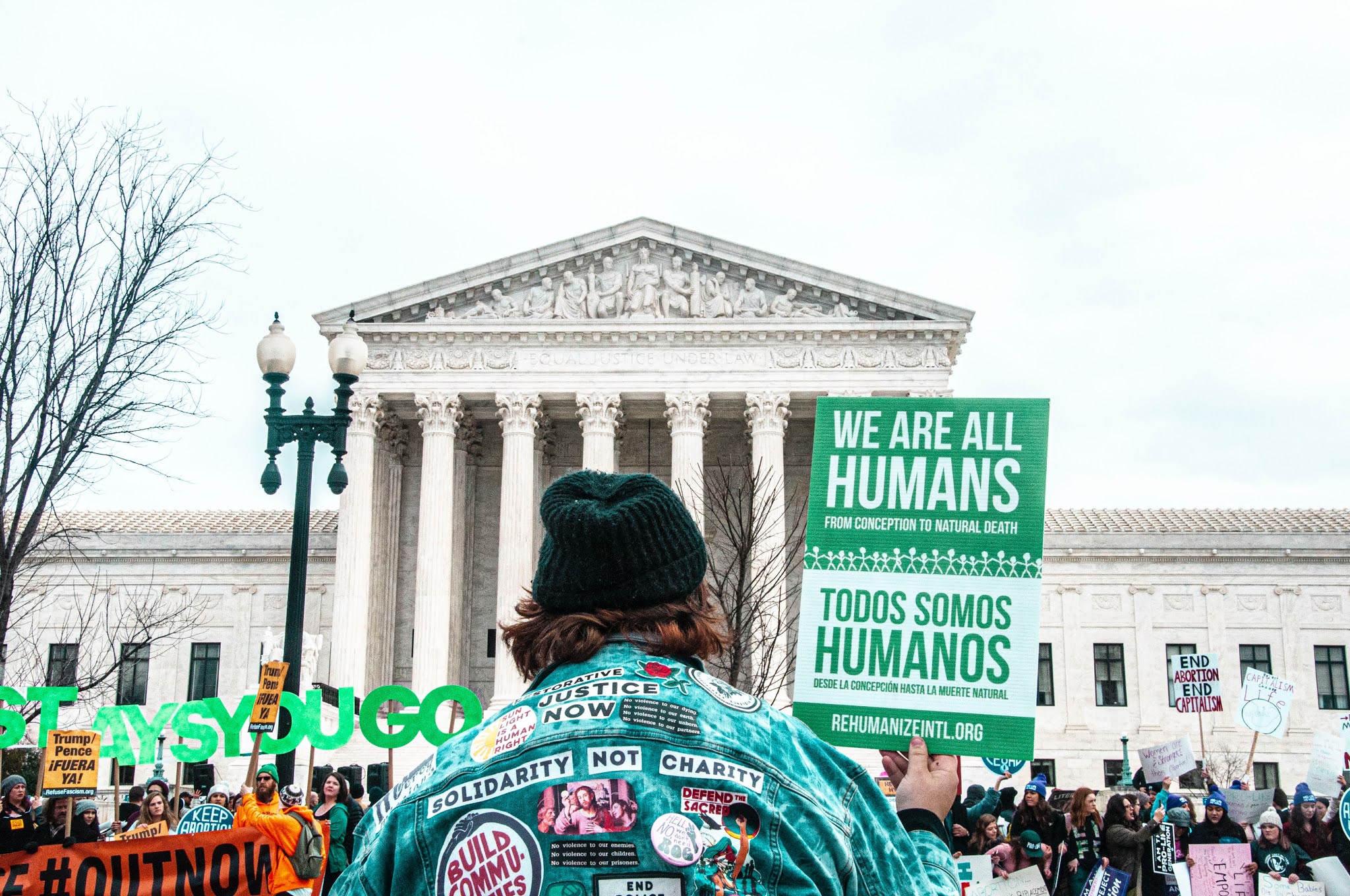 | A person stands in front of the Supreme Court with a sign that reads “We are all humans / Todos somos humanos.” Image credit: Maria Oswalt on Unsplash |