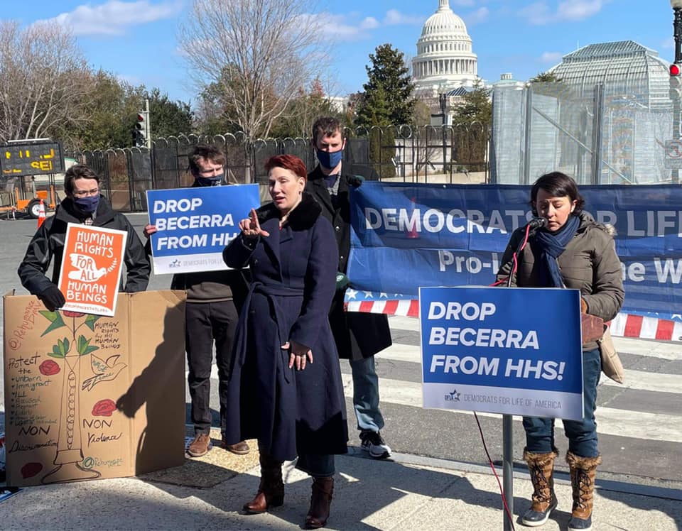 On Saturday, Democrats for Life of America held a press conference outside HHS headquarters to oppose Becerra. Longtime SPL volunteer Nora Brennan was among the speakers. You can watch her speech here (starting nine minutes in) and a transcript is below: