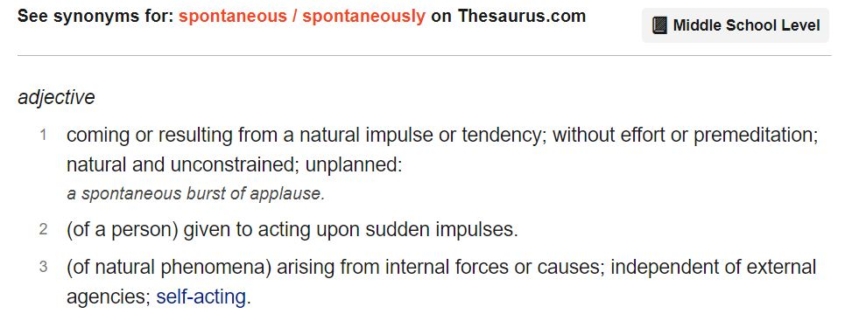 This understanding of “spontaneous” is not the usage meant in the phrase “spontaneous abortion.” Instead, in this usage, the word “spontaneous” is referring to definitions #3 and #5 of the screencap: “arising from internal forces or causes; independent of external agencies,” and “produced by natural processes.” It means that the embryonic death happened naturally, not because of external action or effort. “Spontaneous abortion” is in contrast with induced abortions, in which people take actions to cause the pregnancy loss.