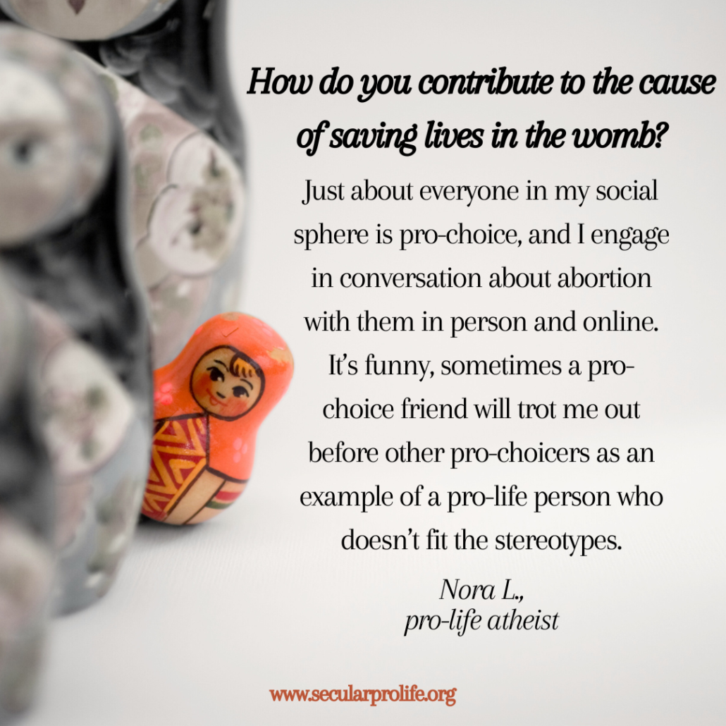 Once a month or so, the Secular Pro-Life blog features a short interview with a pro-life atheist. (See the full series of interviews here.) Although Secular Pro-Life is not exclusively for atheists, historically atheists have played a key role in the organization. As atheists become more prominent in the pro-life movement generally, we’re excited for the opportunity to share their stories. This month, we welcome Nora L.!