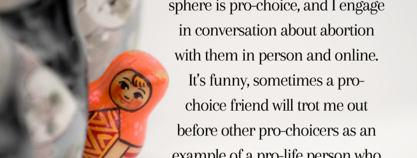 I don’t do as much as I should. I’m a credentialed sex educator, and I’ve taught kids about fetal development and contraception options through a comprehensive sex education program. I spent about a decade working in child welfare and adoption. I’ve marched, and I donate to leftist pro-life organizations when I can. Just about everyone in my social sphere is pro-choice, and I engage in conversation about abortion with them in person and online. It’s funny, sometimes a pro-choice friend will trot me out before other pro-choicers as an example of a pro-life person who doesn’t fit the stereotypes.
