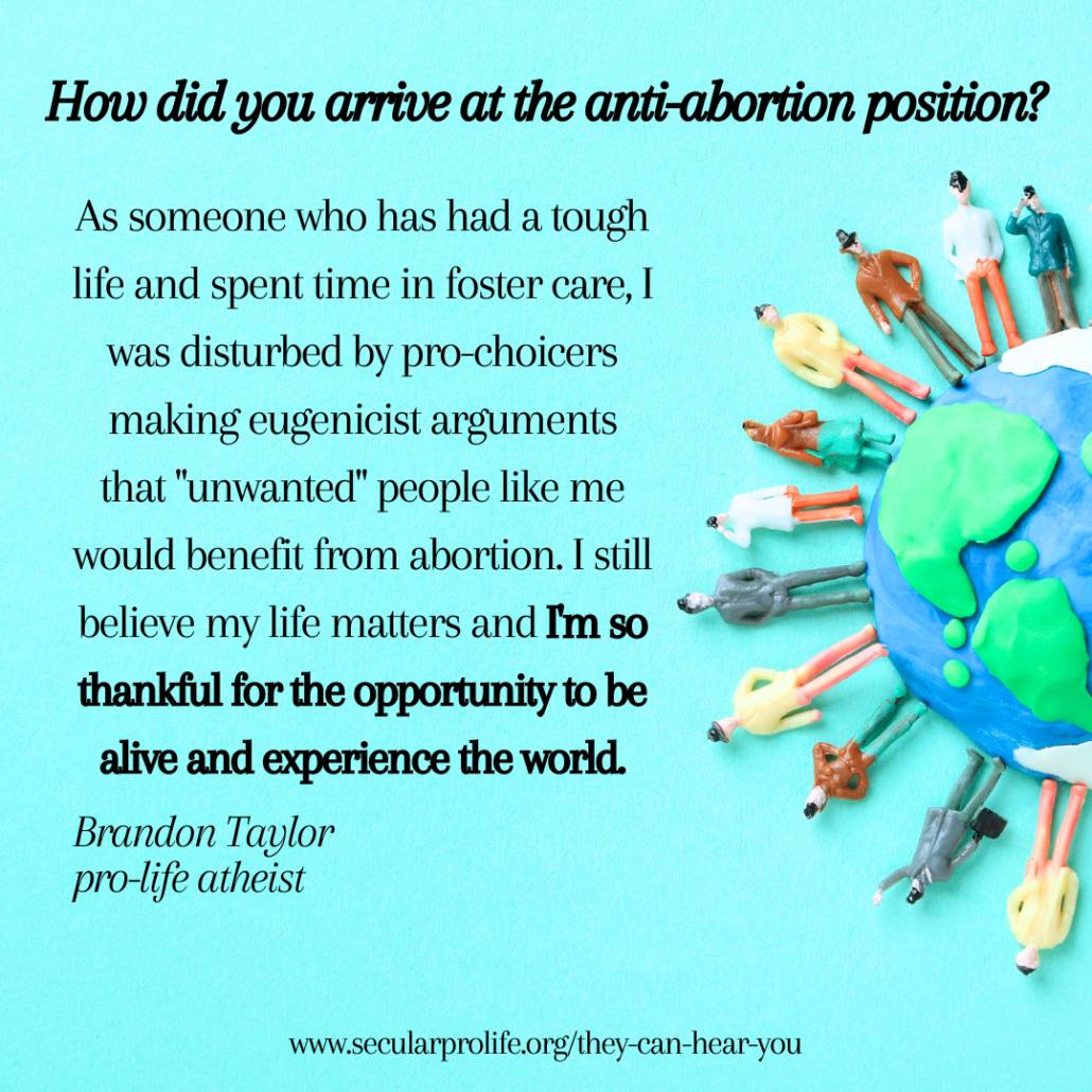 Once a month or so, the Secular Pro-Life blog features a short interview with a pro-life atheist. (See the full series of interviews here.) Although Secular Pro-Life is not exclusively for atheists, historically atheists have played a key role in the organization. As atheists become more prominent in the pro-life movement generally, we’re excited for the opportunity to share their stories. This month, we welcome Brandon Taylor!