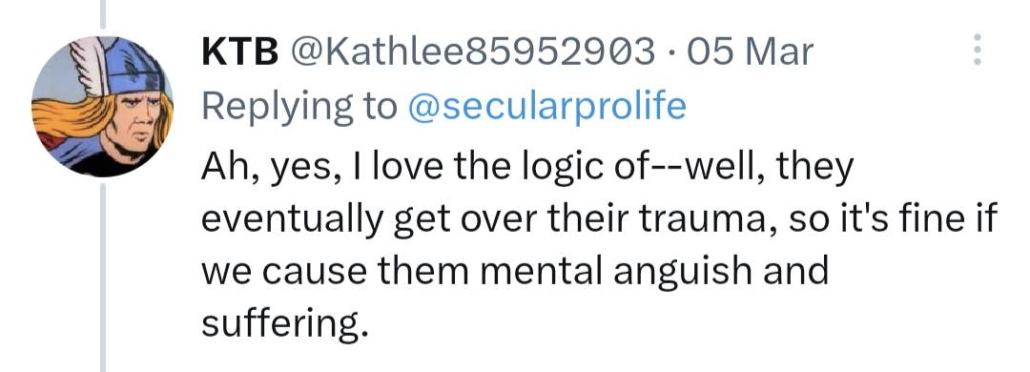 We don’t think abortion should be outlawed because when women give birth after being denied abortion, nearly all of them end up saying they no longer wish they’d aborted. We think abortion should be outlawed because it kills valuable human beings. We talk about the emergent positive emotions of women who were denied abortion for other reasons.
