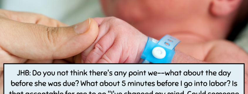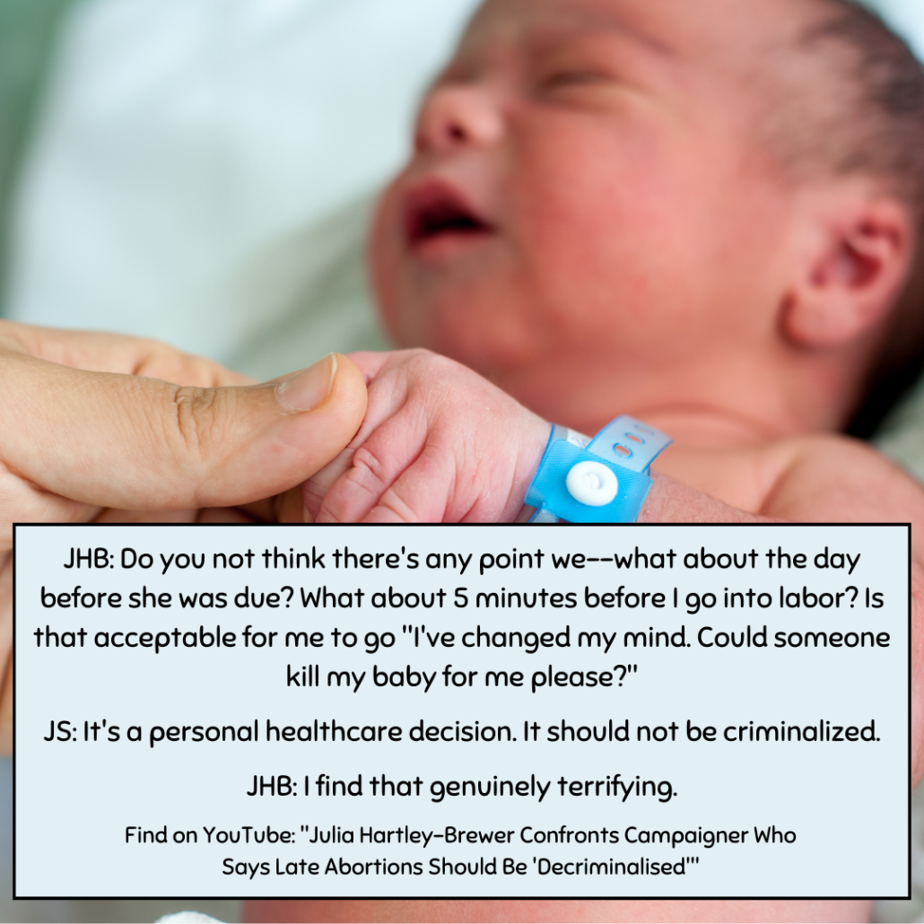 JHB: Most men who go to prison have got kids too. Look I don’t think it’s ideal. I don’t think it’s the right decision. I think it’s a desperate situation. There’s lots of personal aspects here. But this is being extrapolated by groups like yours and people like you saying it shouldn’t be a criminal act because it’s “just healthcare.” I don’t think that my 8 month old baby in my womb was just a matter of healthcare. She was already a viable future human being. Do you not think there’s any point we–what about the day before she was due? What about 5 minutes before I go into labor? Is that acceptable for me to go “I’ve changed my mind. Could someone kill my baby for me please?”