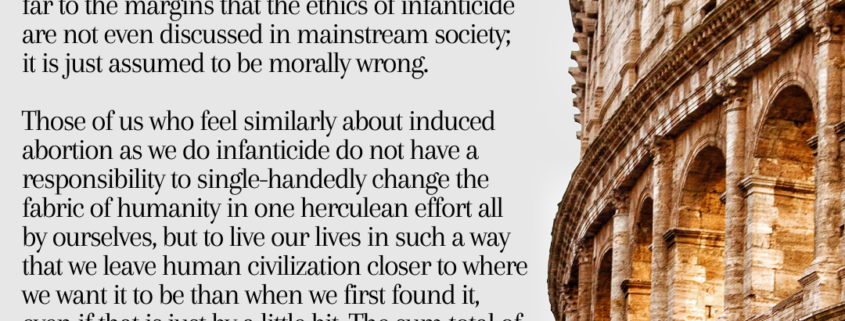 Those of us who feel similarly about induced abortion as we do infanticide do not have a responsibility to single-handedly change the fabric of humanity in one herculean effort all by ourselves, but to live our lives in such a way that we leave human civilization closer to where we want it to be than when we first found it, even if that is just by a little bit. The sum total of all these millions of lives thus lived will lead to large, generational changes that push induced abortion to the margins of human civilization much in the same way infanticide has been.