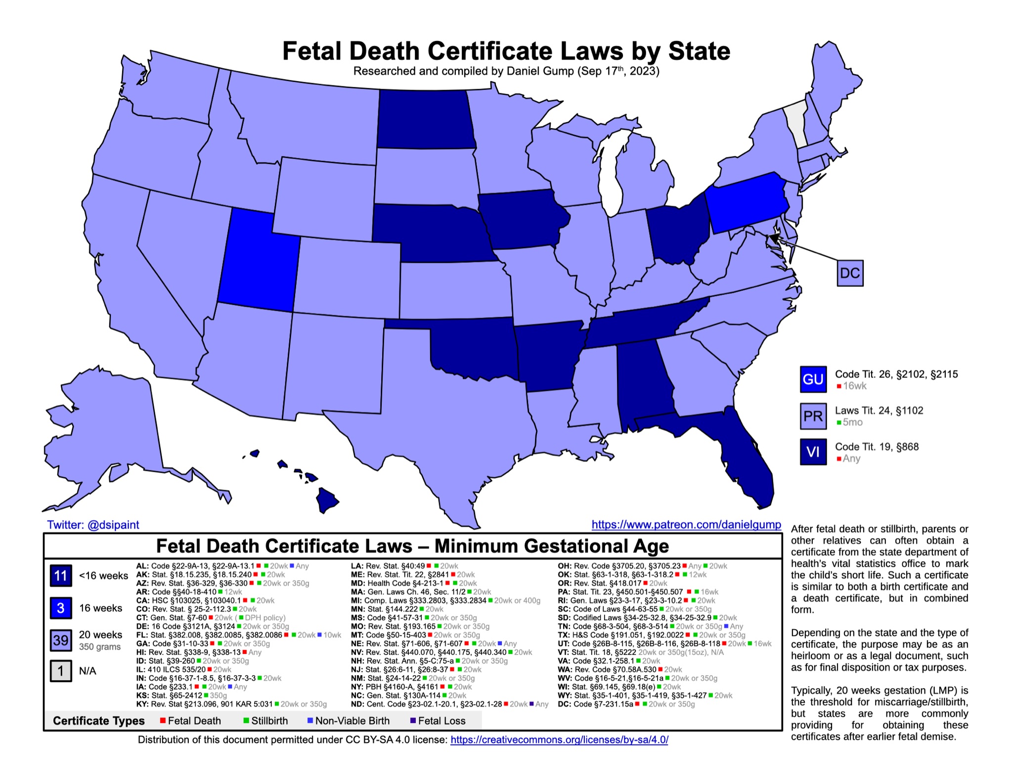 The next claim is that unborn children are not yet alive because it is not possible to obtain birth certificates or death certificates for them. This is also incorrect, as every state except Vermont offers some form of official document upon miscarriage or stillbirth of the unborn child, whether that document is a fetal death certificate, a fetal loss certificate, a certificate of birth resulting in stillbirth, a certificate of non-viable birth, or multiple of these types. (Vermont does still document vital statistics with stillbirths.) Of these certificates, two states plus Guam offer them from sixteen weeks gestation, and ten states plus the US Virgin Islands offer them earlier than sixteen weeks gestation.