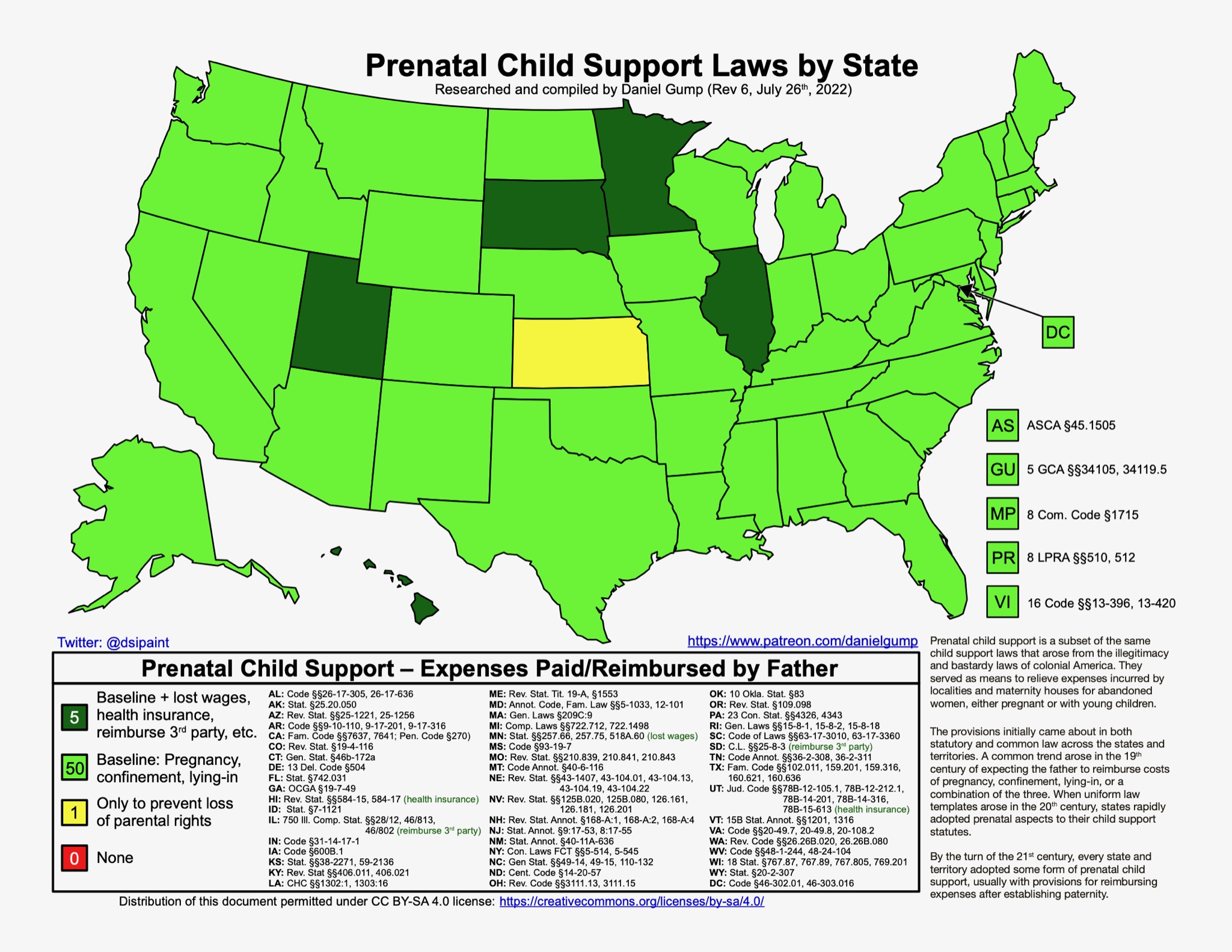 I have previously written several articles and a book on the topic of prenatal child support, so here I will touch on the topic just briefly before focusing on the other items. In short, the concept of prenatal child support has existed for a while in the United States: not just years, not just decades, but centuries. Georgia and Pennsylvania have required fathers to pay for a portion of the mothers’ prenatal expenses within child support laws since the late eighteenth century. Eleven states had such laws by the close of the nineteenth century, and every state and territory has such a law now (with the average year of enactment being 1920). The issue is that most states have prenatal child support laws so old that prenatal paternity testing did not yet exist, so the support payments still work on retroactive bases within all states except those where legislatures have revised the laws in recent years (such as Hawaii and Utah).
