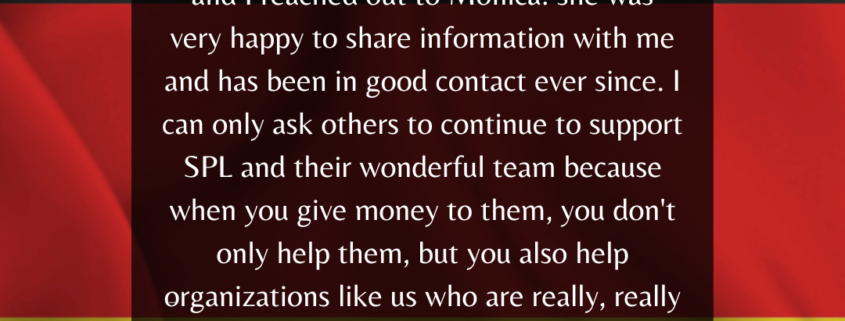 I can only ask others to continue to support SPL and their wonderful team because when you give money to them, you don’t only help them, but you also help organizations like us who are really, really grateful for their work.