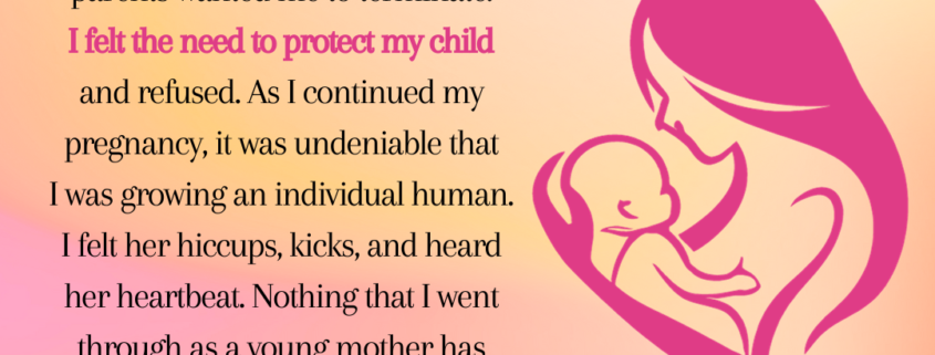 I grew up pro-choice, but then I was pregnant in high school and my parents wanted me to terminate. I felt the need to protect my child and refused. As I continued my pregnancy, it was undeniable that I was growing an individual human. I felt her hiccups, kicks, and heard her heartbeat. Nothing that I went through as a young mother has been worth my daughter’s life.