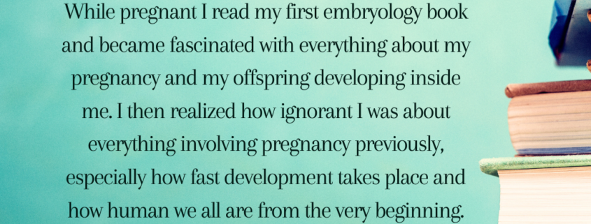 At the age of 21 I became pregnant, and although unexpected I had a lot of support from my family and my boyfriend at the time, now husband. While pregnant I read my first embryology book and became fascinated with everything about my pregnancy and my offspring developing inside me. I then realized how ignorant I was about everything involving pregnancy previously, especially how fast development takes place and how human we all are from the very beginning.
