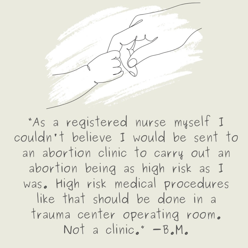 As a registered nurse myself, I couldn’t believe I would be sent to an abortion clinic to carry out an abortion being as high risk as I was. High risk medical procedures like that should be done in a trauma center operating room. Not a clinic.