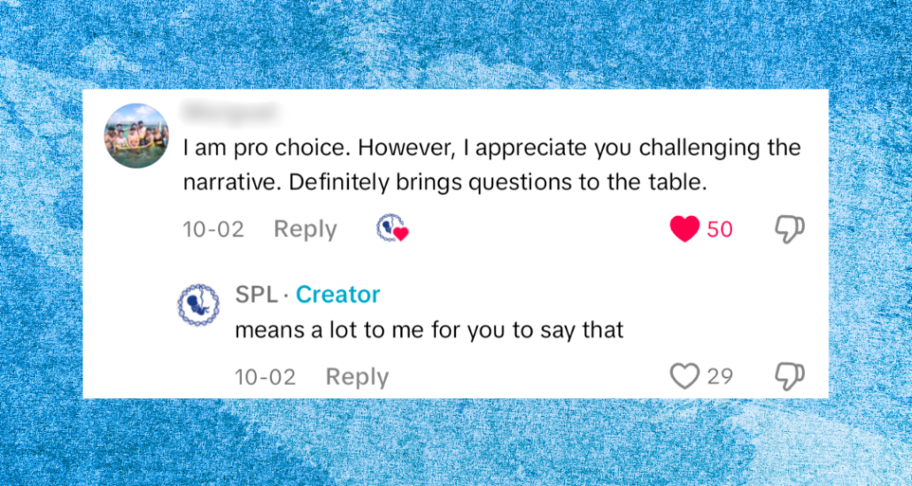 In April 2023, SPL followers tagged me in the comments of one of Jen’s videos in which she claimed “late-term abortion is not happening, it’s called having a baby.” She went on to describe parents who receive adverse prenatal diagnoses for very wanted children and choose to induce labor early and say goodbye to those children.