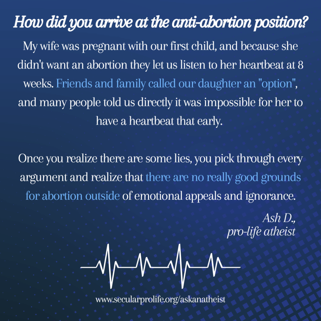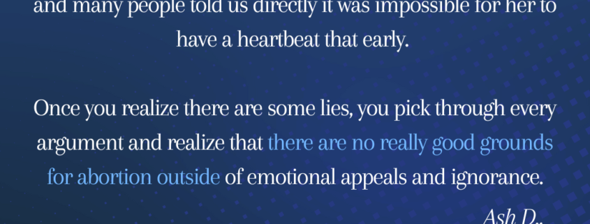 My wife was pregnant with our first child, and because she didn’t want an abortion they let us listen to her heartbeat at 8 weeks. Friends and family called our daughter an “option”, and many people told us directly it was impossible for her to have a heartbeat that early. Once you realize there are some lies, you pick through every argument and realize that there are no really good grounds for abortion outside of emotional appeals and ignorance.