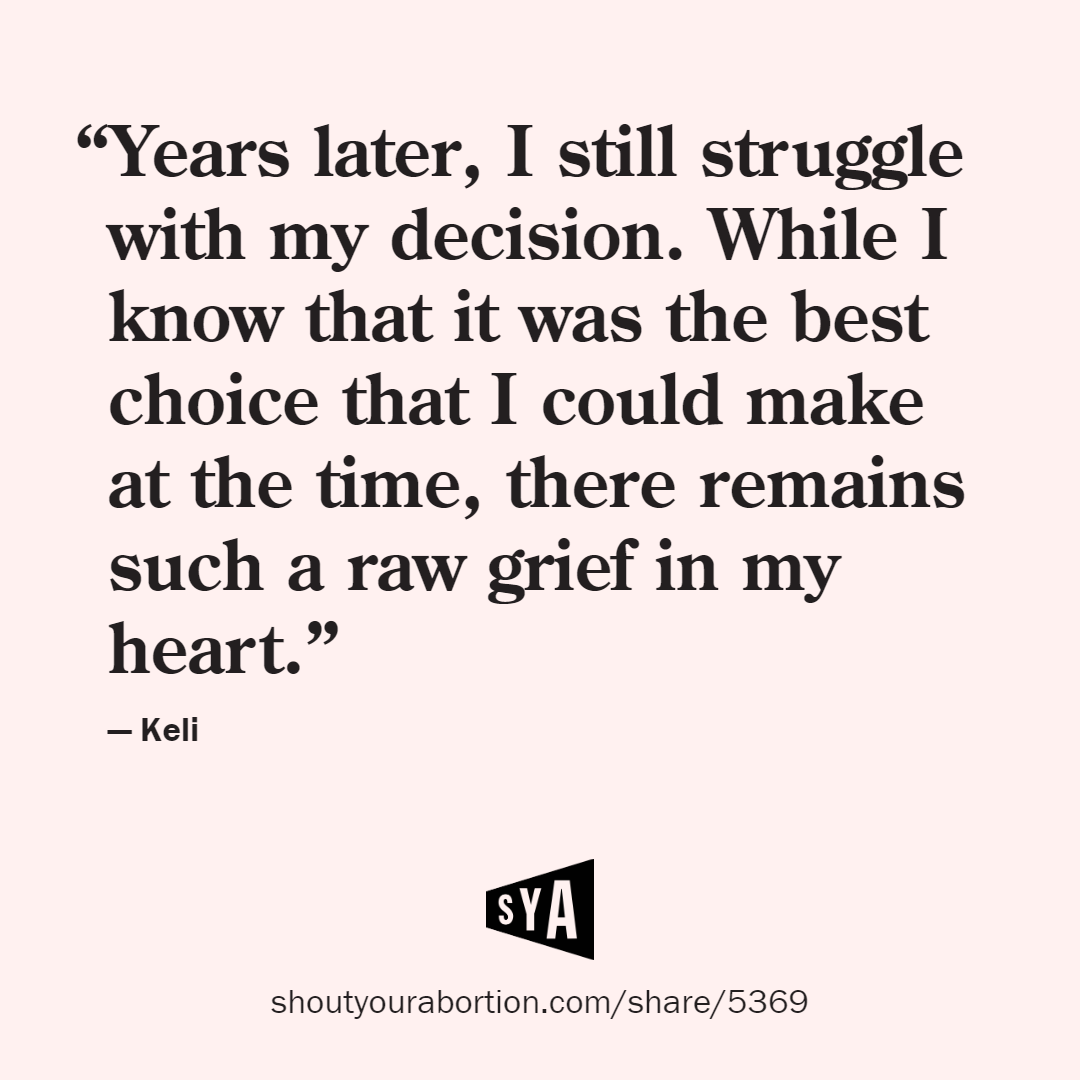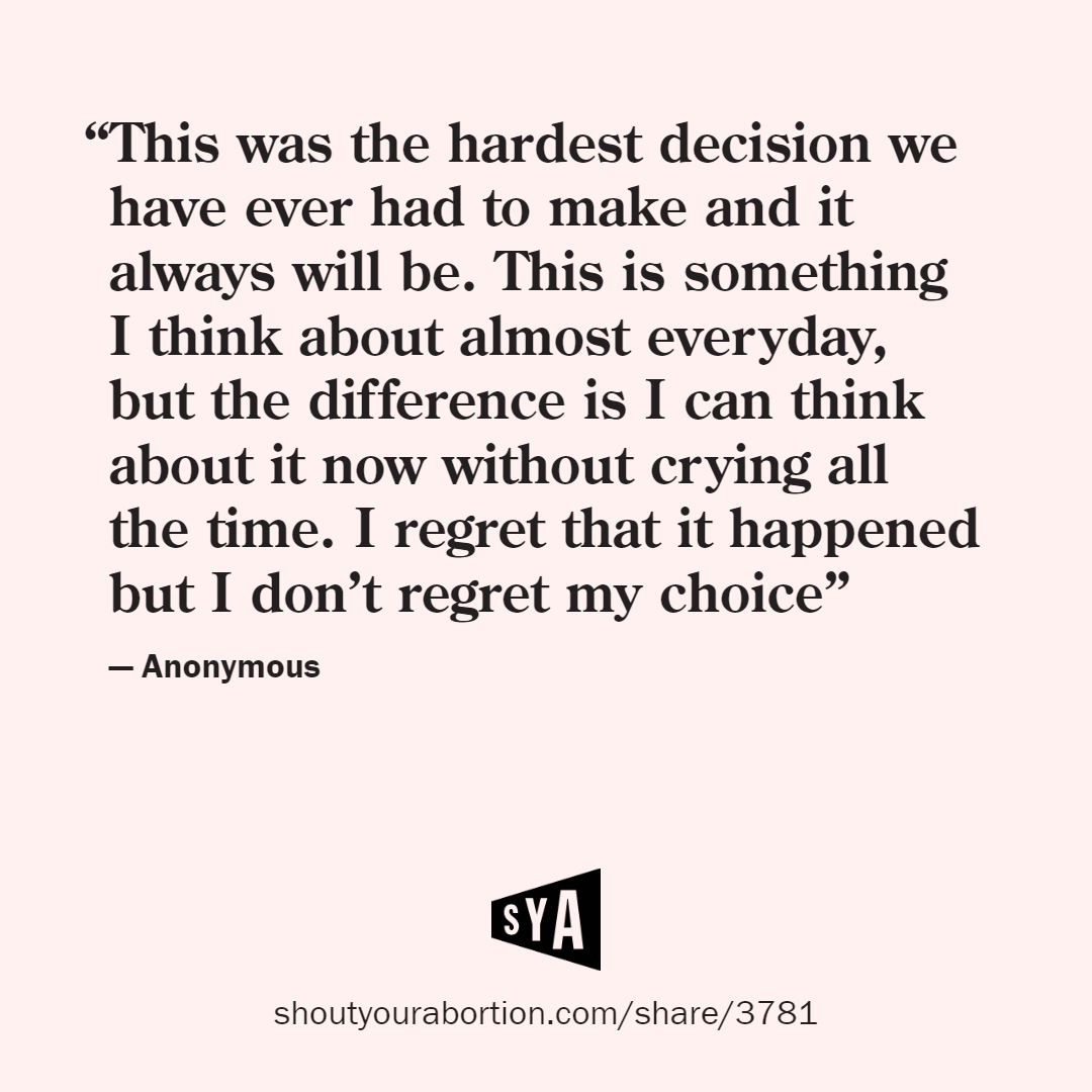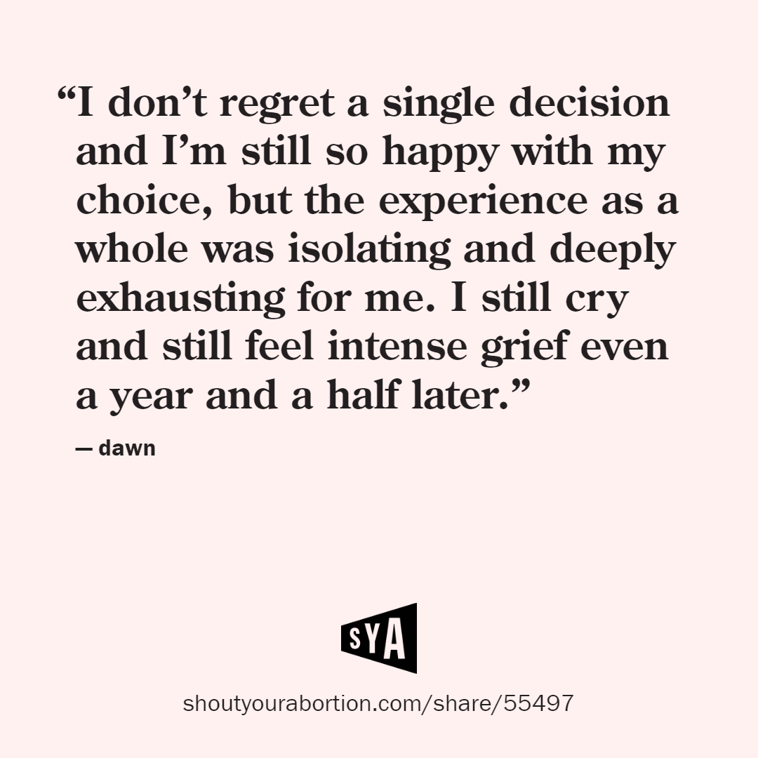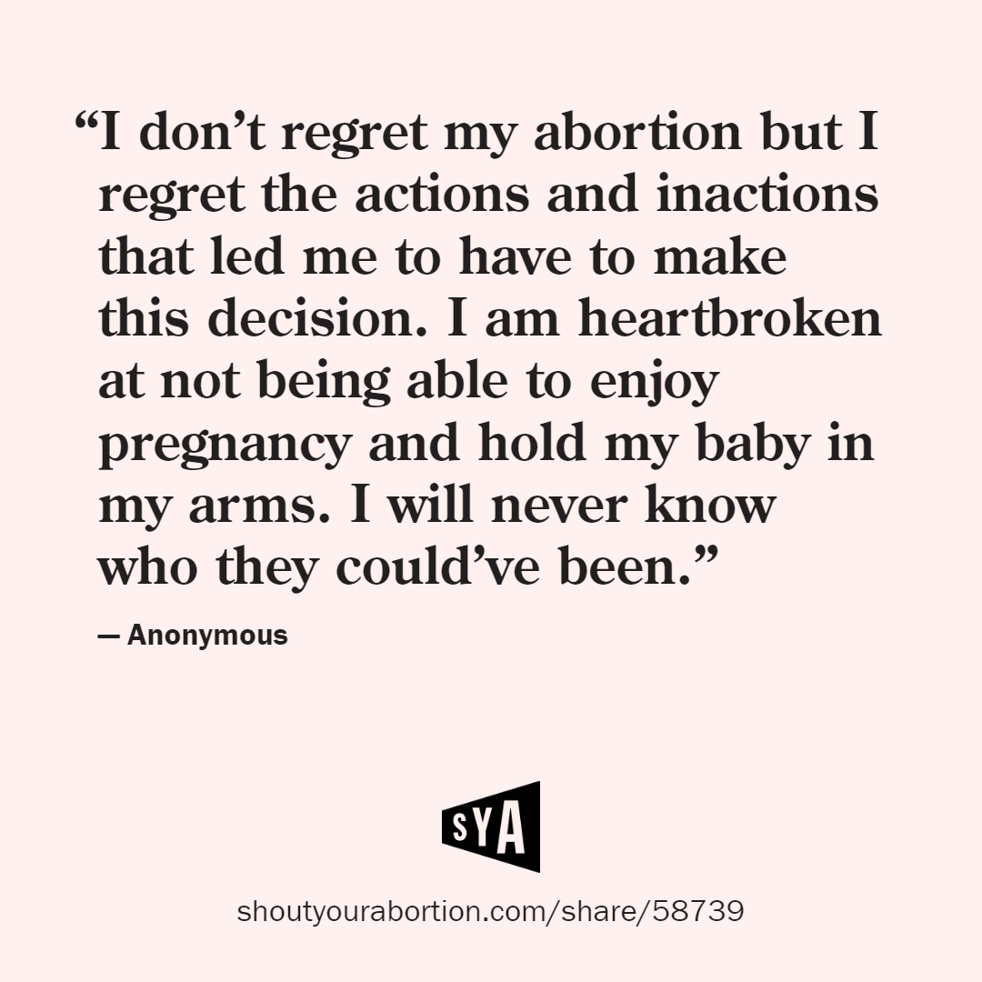 The story-telling abortion rights advocacy group, Shout Your Abortion (SYA), features many testimonials from women who affirm abortion was right for their circumstances. However a subset of those testimonials reveal complex emotional positions, with the same women who say abortion was right for them expressing deep grief and pain.