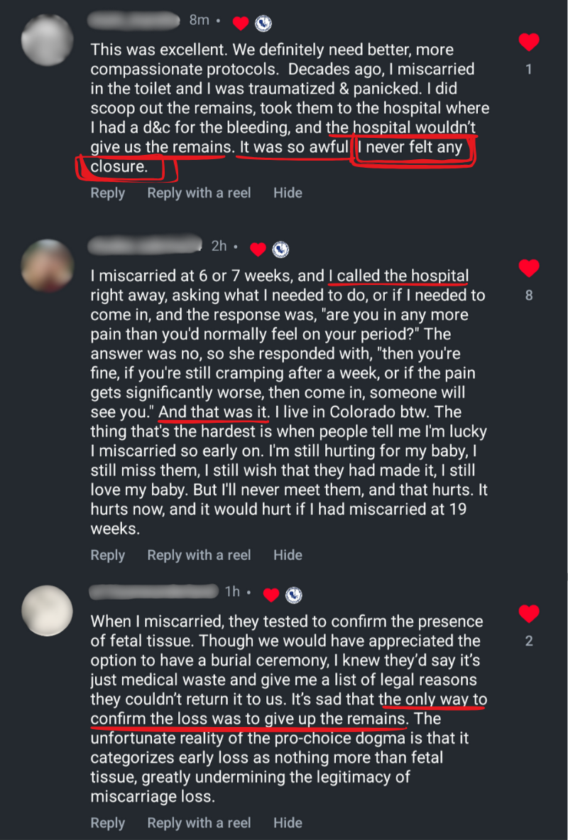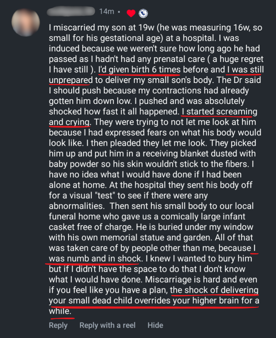 It’s common in pregnancy loss groups for people to feel really traumatized and horrified when they don’t realize what they’re about to go through, partly because society doesn’t talk about miscarriage in general, and so we have the added bonus of, in addition to losing your children, having no preparation for what it’s going to be like, and then they end up miscarrying into a toilet not realizing they don’t know what to do with the remains. Some women try to fish it out and then maybe, I don’t know, bury them in the backyard. Some women panic and flush and then really wish they never had. The point is that it’s confusing, it’s traumatic, and society does not educate or prepare people to handle it when they’re in the situation or to support others they know who go through it.