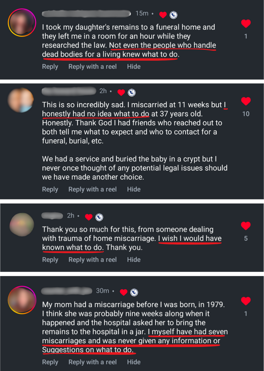 Post-recording addendum: In response to the above video, SPL followers shared their own stories of miscarriage, with common themes of shock, confusion, and a society ill-equipped to really help. We’re humbled and honored that you shared these experiences with us. We share these stories here in the hopes other will read, learn, and help us build a more compassionate culture.