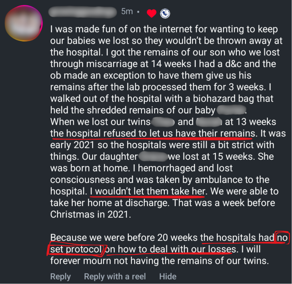 There are medical facilities that will not do that, they won’t honor the parents wishes of how to handle the remains. This is a common problem talked about in pregnancy loss groups.