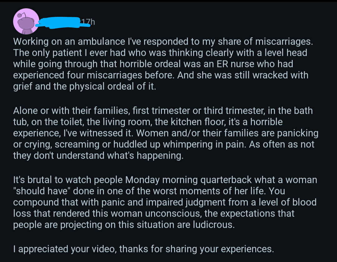 I continue to be appalled at how little society understands miscarriage, and I mean that both in the sense of interpersonal relationships–how little people understand the emotional or psychological or physical effects of miscarriage–and also in terms of formal institutions and how little we have appropriate protocols for helping people who are going through it, which is kind of crazy given how incredibly common miscarriage is and how women have been experiencing miscarriage since humans existed.