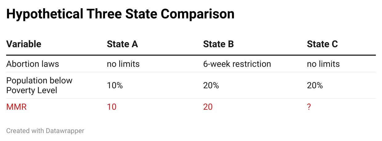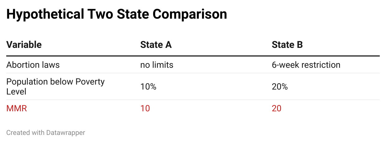 For example, imagine you have State A and State B. State A has no limits on abortion, 10% of its population below the poverty line, and an MMR of 10 women per 100,000 live births. State B has a 6-week restriction on abortion, 20% of its population below the poverty line, and an MMR of 20 women per 100,000 live births.