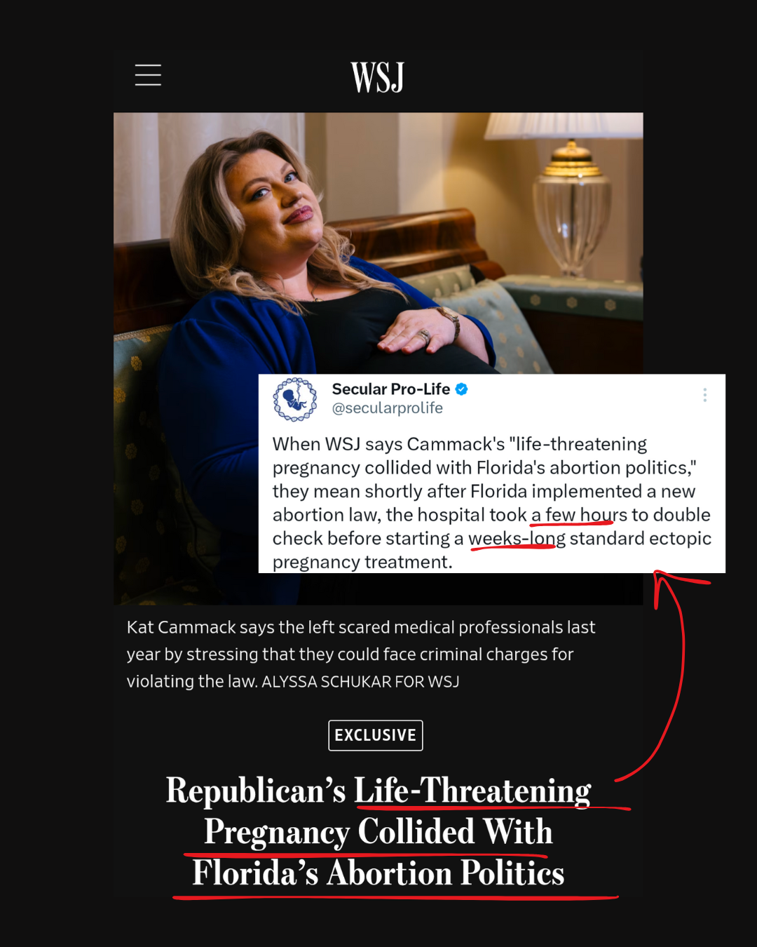 A June 2025 article by Katy Ferek in the Wall Street Journal, “Republican’s Life-Threatening Pregnancy Collided With Florida’s Abortion Politics,” looks at an instance that occurred in May 2024 when Rep. Kat Cammack experienced an ectopic pregnancy and dealt with a medical team hesitant about how to proceed. The Wall Street journal framed Cammack’s story as Florida’s abortion ban creating a life-threatening situation. Other articles claim Cammack “nearly died.” Countless online commenters have argued Cammack (who is pro-life) should have been denied the care they assume she wants to deny other people. As usual, this is nonsense.