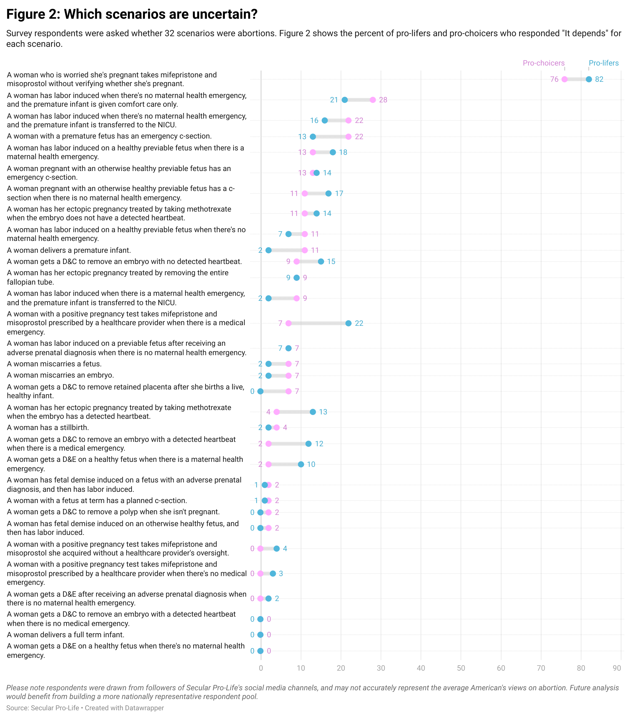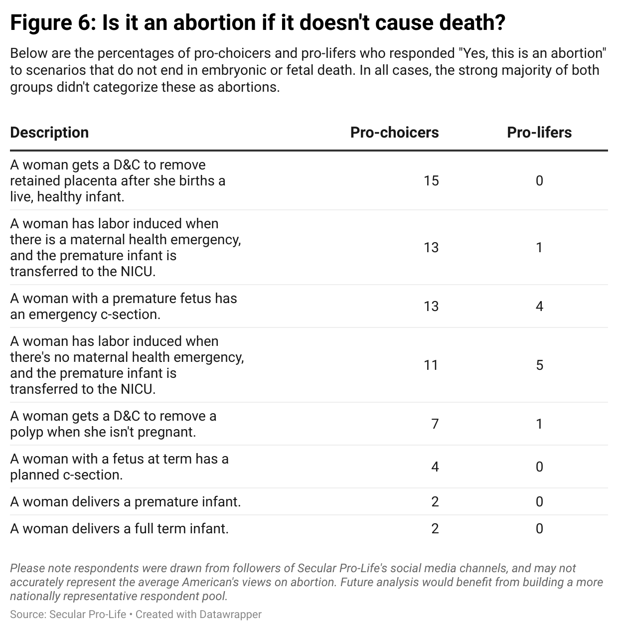 There were scenarios that both pro-life and pro-choice respondents generally agreed either were abortions (most interventions resulting in death without medical emergency) or were not (scenarios that didn’t result in death). Whether a scenario qualifies as an “abortion” isn’t always confusing, even when our ethical views of the scenario aren’t aligned.