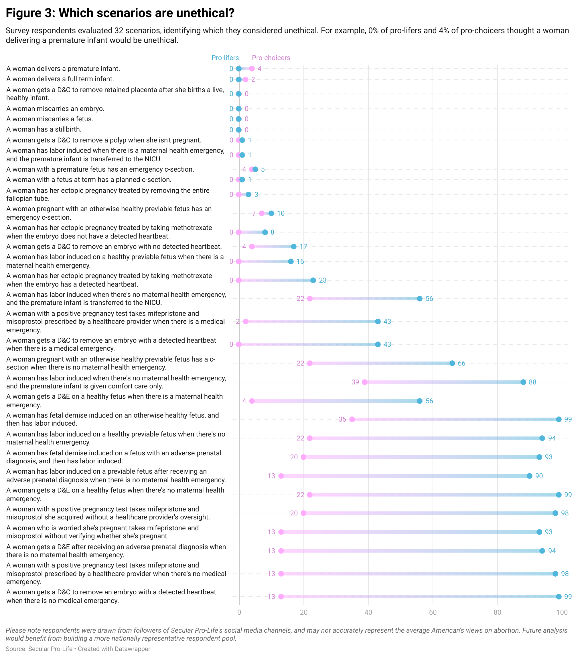 Similar to Figures 1 and 2 above, in Figure 3 you can see the percent of respondents who categorized a given scenario as unethical out of the total pool of either pro-choice (n=46) or pro-life (n=730) respondents.