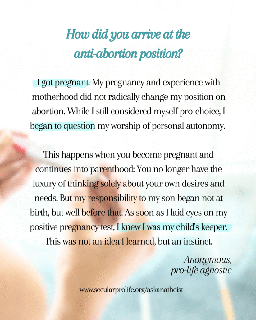 Once a month or so, the Secular Pro-Life blog features a short interview with a pro-life atheist or agnostic. (See the full series of interviews here.) Although Secular Pro-Life is not exclusively for atheists and agnostics, historically they have played a key role in the organization. As they become more prominent in the pro-life movement generally, we’re excited for the opportunity to share their stories. This month, we welcome an anonymous pro-life agnostic.