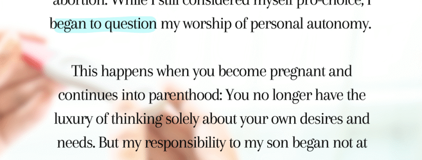 Then, I got pregnant. My pregnancy and experience with motherhood did not radically change my position on abortion. While I still considered myself pro-choice, I began to question my worship of personal autonomy. This happens when you become pregnant and continues into parenthood: You no longer have the luxury of thinking solely about your own desires and needs. But my responsibility to my son began not at birth, but well before that. As soon as I laid eyes on my positive pregnancy test, I knew I was my child’s keeper. This was not an idea I learned, but an instinct.