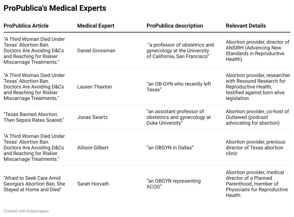 ProPublica persistently omits their experts’ deep ties to abortion advocacy. Leaving out this context misleads readers, and erases the lines between investigative journalisms and pro-abortion storytelling.