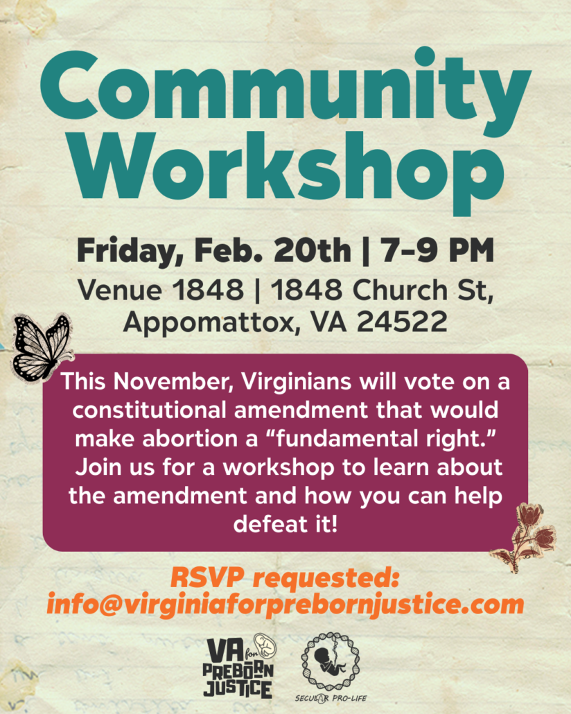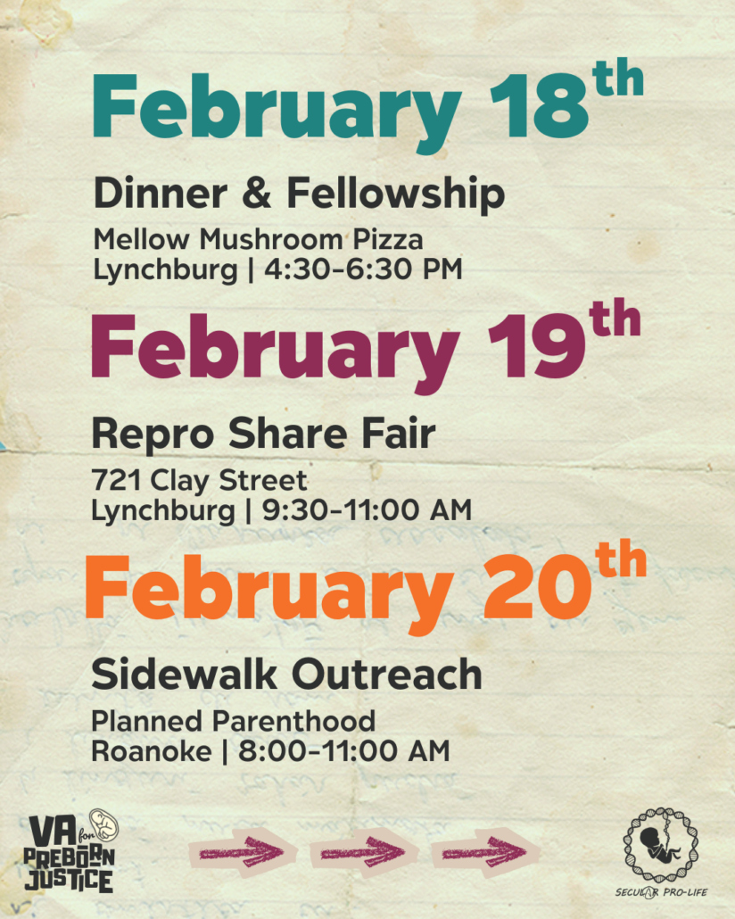 I wanted to let you know that this week, Secular Pro-Life is teaming up with Virginia for Preborn Justice to help educate communities in Central Virginia about the upcoming “Reproductive Freedom” amendment on the ballot this November.