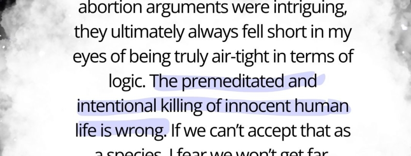 I studied the issues of abortion in my university philosophy classes where we debated and listened to presentations. Although many pro-choice and pro-abortion arguments were intriguing, they ultimately always fell short in my eyes of being truly air-tight in terms of logic. The premeditated and intentional killing of innocent human life is wrong. If we can’t accept that as a species, I fear we won’t get far.