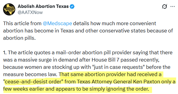 But in order for laws to have a strong deterrent effect, people have to believe those laws will be enforced. Abolitionists recognize this connection when it comes to incrementalist laws. Abolish Abortion Texas, for example, pointed out the total lack of deterrence in September 2025 when Texas AG Ken Paxton sent a cease and desist order to out-of-state abortion pill providers and they simply ignored it.