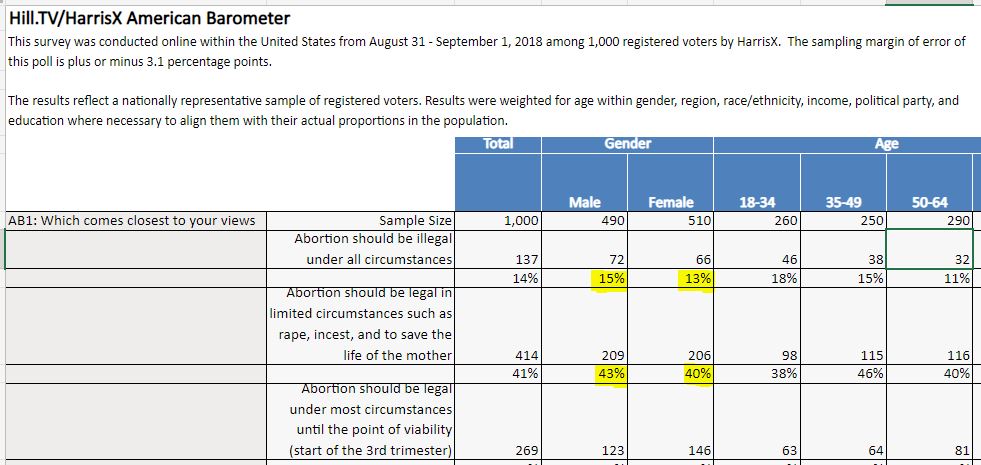 HarrisX conducted a 2018 poll on behalf of The Hill which found that 53% of women (and 58% of men) said abortion should either be legal only for rape, incest & to save the life of the mother (40% of women/43% of men), or illegal all the time (13% of women/15% of men). Note these stats are for the entire polling sample set, not only the Republican men and women. The Hill discusses the poll here.